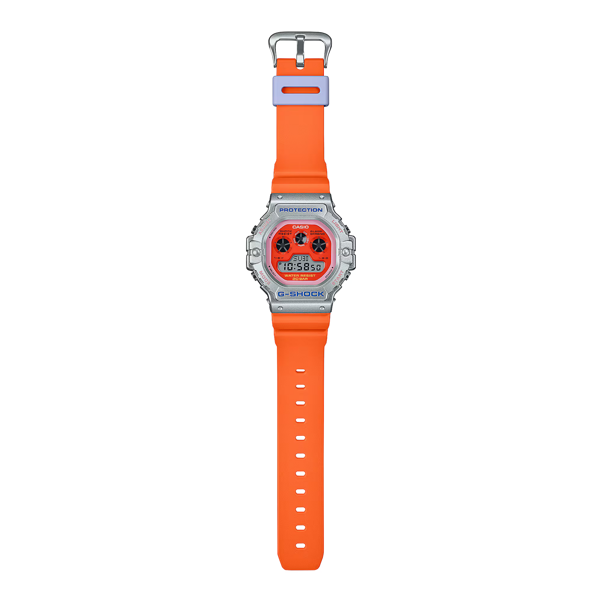 Declare your love of joyful, living color with an exuberant, effervescent G-SHOCK. The design comes together with a bezel in silver metallic coating and an LCD in a mirror finish. Add in vibrant green, orange, or blue on the band and inlaid lettering on the bezel, and you’re ready to take on the day with this bright, dynamic timepiece.