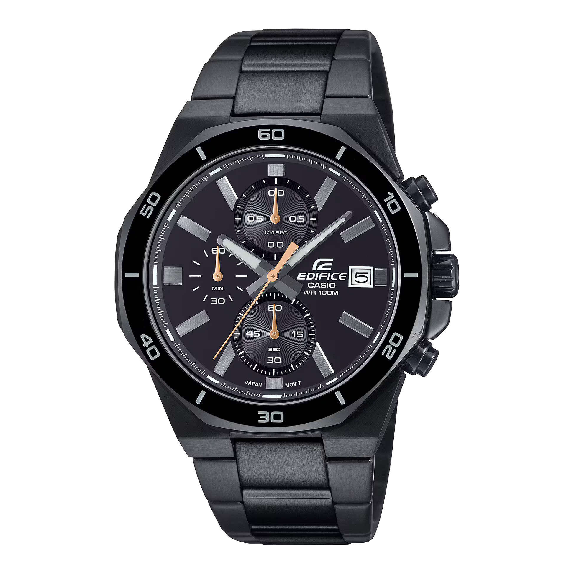 Slip on a classic with a colorful twist, and enjoy the simple sophistication of a sporty chronograph with 10-bar water resistance. The flat front surface of the octagonal bezel is polished to a hairline finish and paired with mirror-finish sides, creating a handsome textural contrast. The black ion-plated case and band, accented with a touch of color on the seconds hand, project the essence of sporty EDIFICE style.