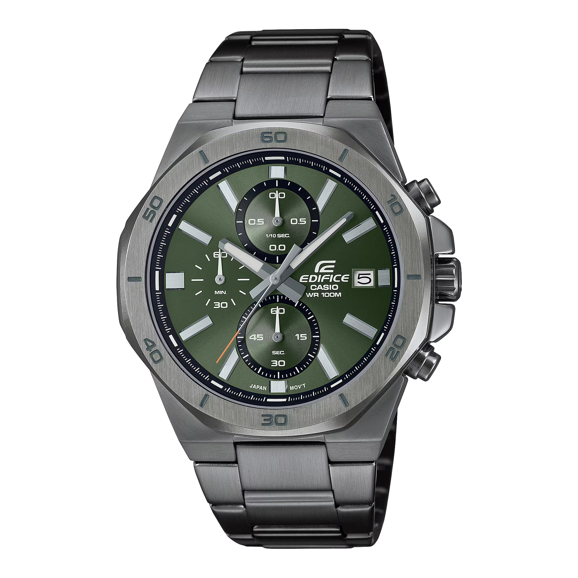 Make a dynamic, bold statement — a classic EDIFICE sports chronograph with an octagonal bezel in a solid, strong design. The case and band are finished in gray ion plating for bold style and scratch resistant practicality.