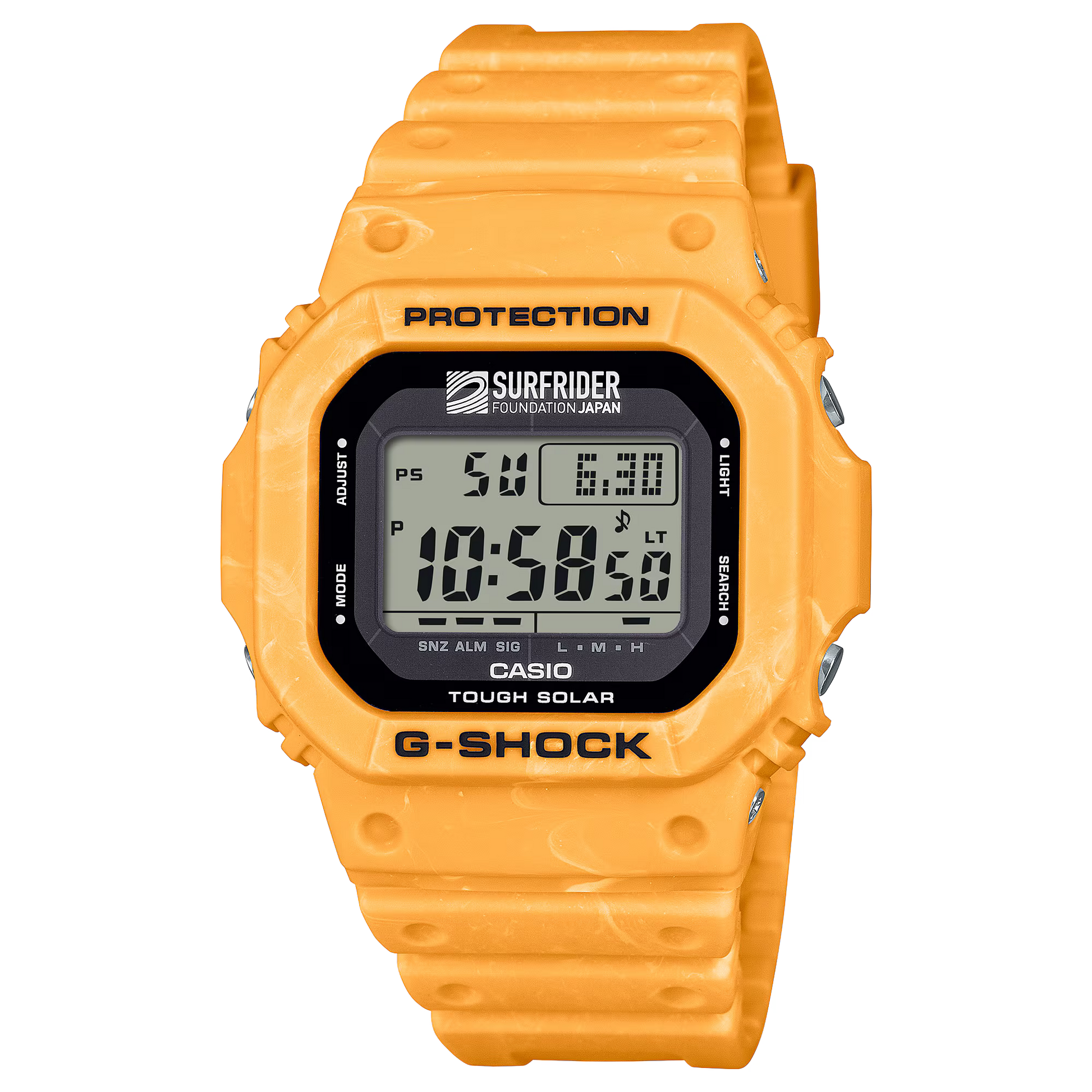 Oneness with nature in the sunrise surf. Strap on a G-SHOCK-Surfrider Foundation Japan collaboration watch designed for surf enthusiasts and extreme sports fans. Sharing a passion for the environment, G-SHOCK is proud to team up with the Surfrider Foundation Japan and its core mission of protecting the marine environment. Inspired by the sunrise surf, the watch captures the serene beauty and warm glow of a beach bathed in morning sunlight. This singular moment is expressed in a variegated blend of harmonious yellow and beige tones. Made with bio-based resin and equipped with Tough Solar technology, the watch embodies our shared commitment to sustainability and harmony with nature. The Surfrider Foundation Japan logo is featured on the face and case back, and the band loop is printed with a befitting hashtag: #oceanfriendlylifestyle. * Due to the characteristics of mixed-color molding, there are individual differences in color and pattern in every timepiece. * Due to the watch’s specific characteristics, the surface resin may exhibit a certain texture.