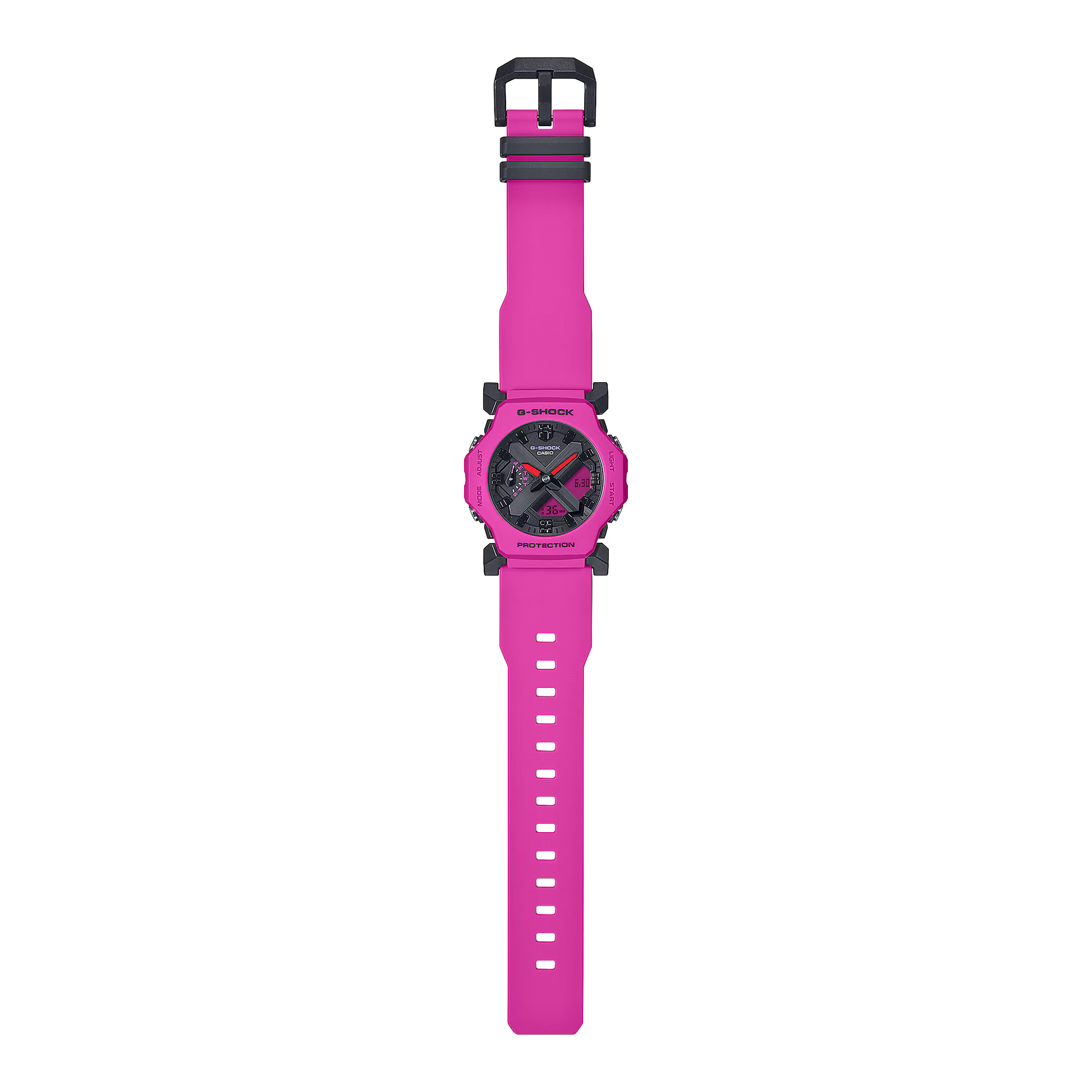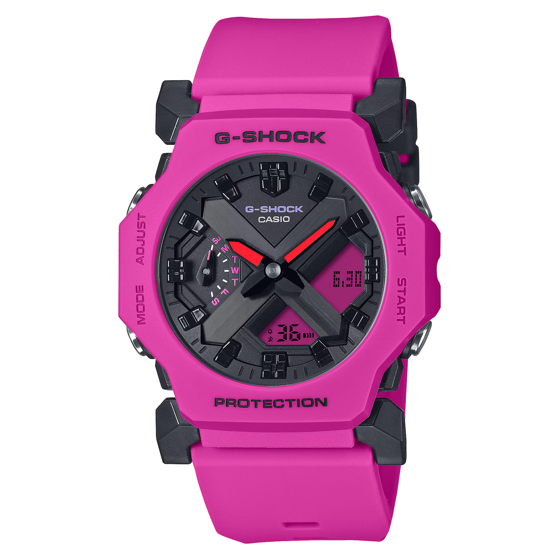 A compact G-SHOCK in a boldly straight-forward design that moves style into the future. The tough digital-analog combination GA-2300 goes smaller and slimmer to meet today’s needs, delivering just what you require from a watch in a minimalist design with a futuristic sensibility. With a case measuring just 45.4 mm in diameter and 11.6 mm slim, this G-SHOCK is significantly smaller than past models. Choose the GA-2300 in classic black or white, or go with the GA-2300-4A in vibrant pink with matching LCD. Effortlessly stylish, the GA-2300 holds the key to all-new possibilities with G-SHOCK.