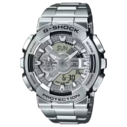 Introducing the GM-110D, an updated take on the ever-popular large case analog-digital G-SHOCK with metal bezel and band. Precision forging, cutting, and polishing, and even special molding techniques, all go into crafting a metal bezel featuring a rugged, high-impact design, for a solid construction that sacrifices nothing in toughness. The case is made of fine resin to protect the module. With a metal band, silver stainless steel bezel, and dial in gun metal gray, the GM-110D-8A is up for anything — work or play.