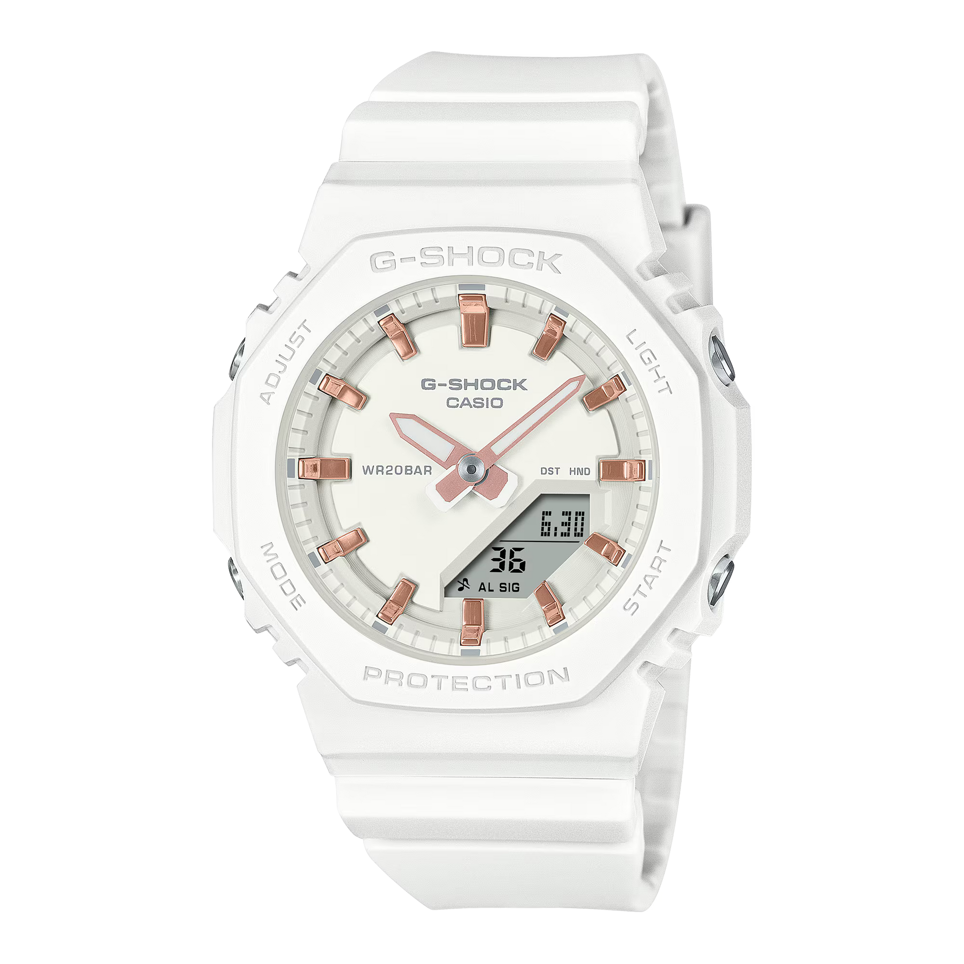 Take your love of the ever-popular digital analog G-SHOCK look to the next level with a shimmering touch of new color. The GMA-P2100 features elegant indexes finished in pink gold vapor deposition and a compact design to fit smaller wrists with total comfort. Key resin components of the band are made with bio-based resin. Produced using renewable organic resources, this material is expected to help reduce environmental impact.