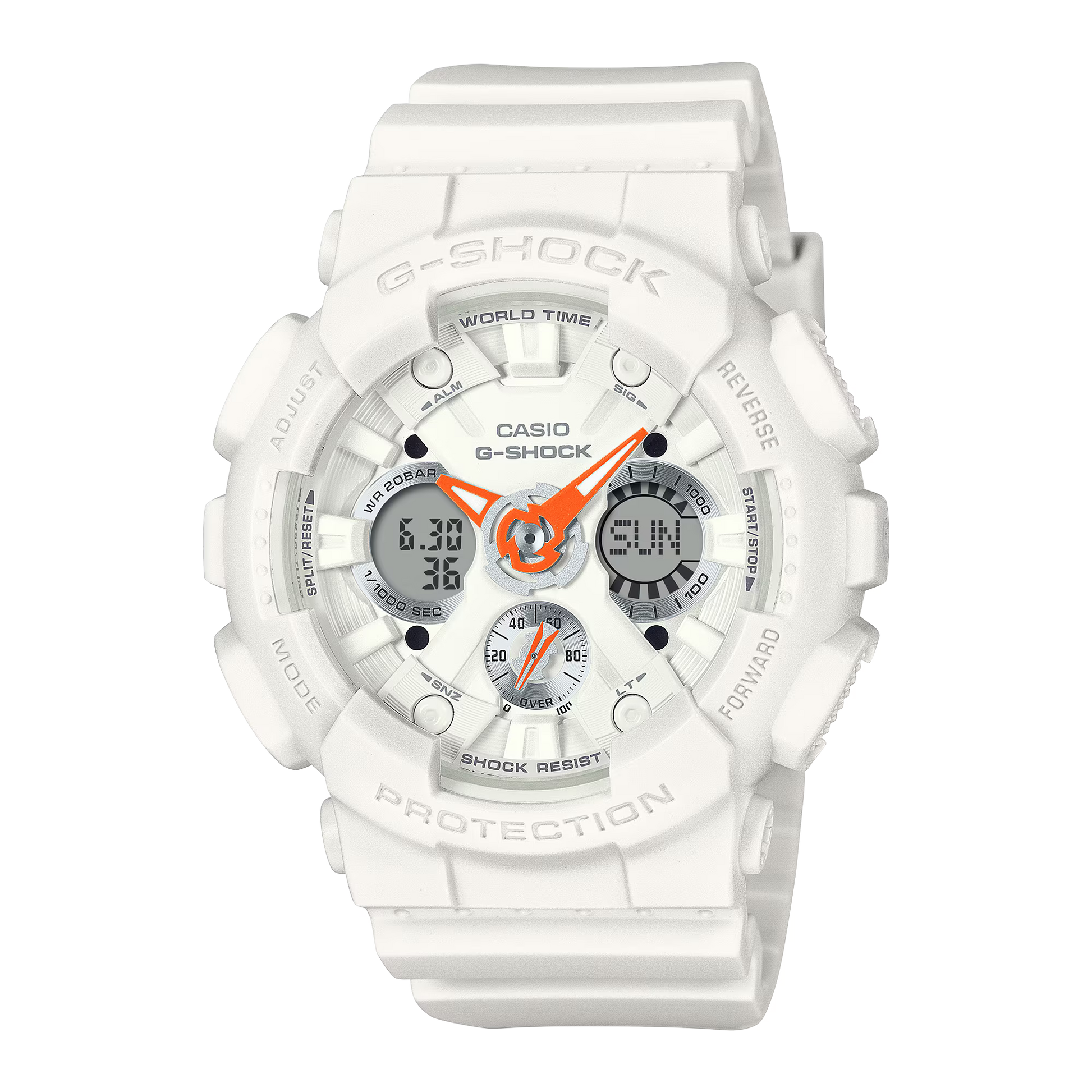 Make your statement cool, contemporary, and sporty, with vivid accent colors that pop. With the GMA-S120SA, we start with classic white and add accents in vibrant hues inspired by athletic gear to create a striking contrast that delivers full-on sporty style. Key resin components used in the bezel and band are made with bio-based resin. Produced using renewable organic resources, this material is expected to help reduce environmental impact. The watch features a distinctive dial with dimensional components for layered depth, finished in a crisp, pure white tone. The watch hands are accented in vibrant orange or blue and coated in phosphorescent white, bringing a refreshing sense of openness to those free and fun summer days.