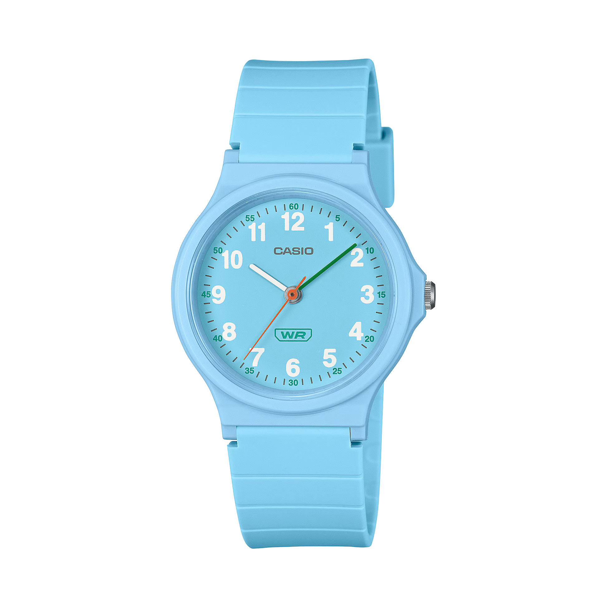 An analog watch with the classic look of hour, minute, and seconds hands in a smaller, easy-to-wear size. The hour and minute hands are colored to match the corresponding index marks, so it’s easy to tell time — making this an ideal first watch. The band is made with bio-based resin, a material expected to help reduce environmental impact.